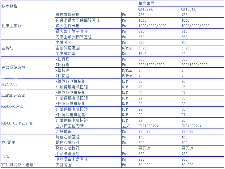 QK1327A,QK1334A機(jī)床為臥式平床身數(shù)控管螺紋車床,采用半閉環(huán)控制。車削主傳動(dòng)為無(wú)級(jí)變速,兩個(gè)聯(lián)動(dòng)控制軸,Z軸和X軸采用滾珠絲杠副加交流伺服電機(jī)實(shí)現(xiàn)縱向和橫向移動(dòng),具有很好的定位精度和重復(fù)定位精度。